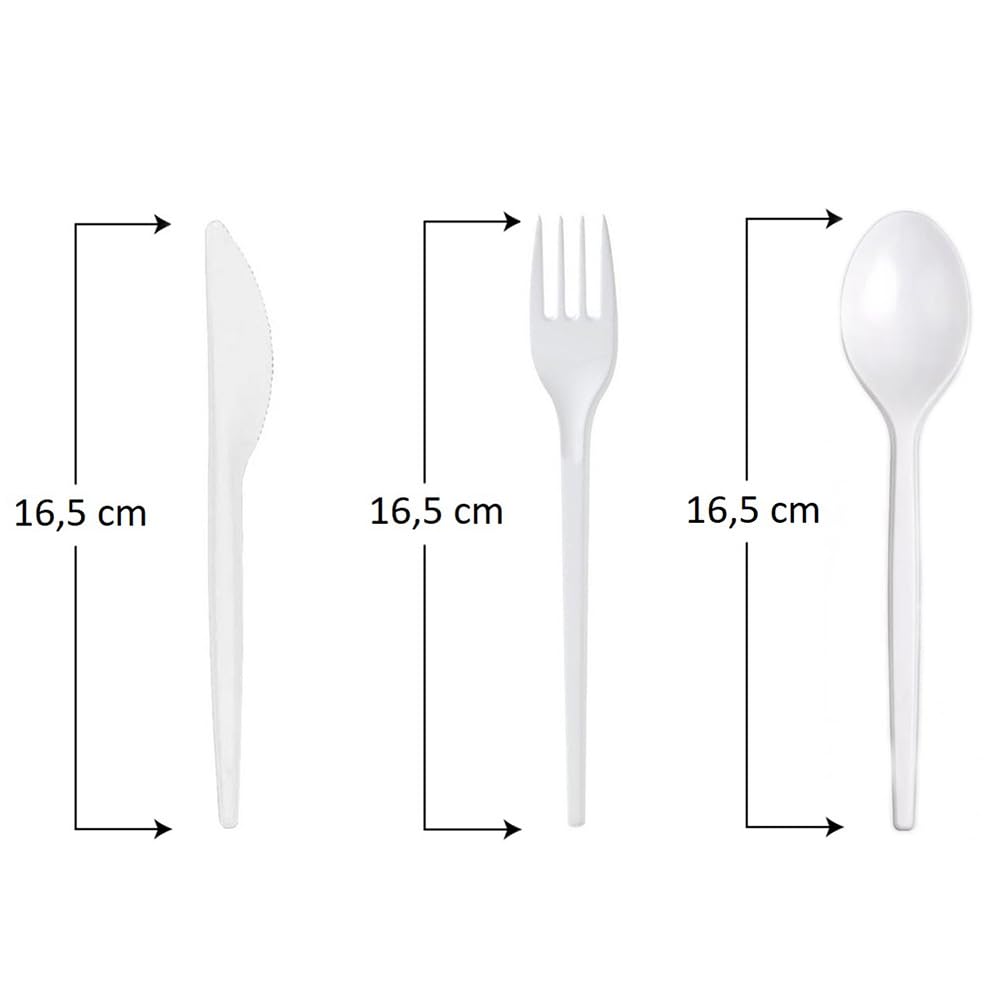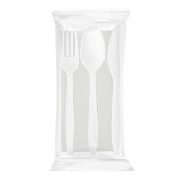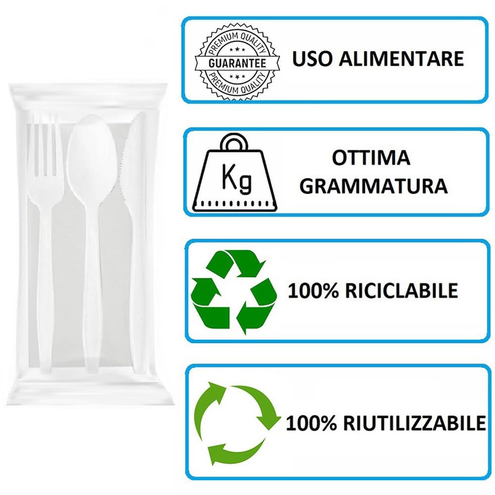 - 100 pezzi (100 confezioni contenenti ognuna una Forchetta, un Cucchiaio, un Coltello e un Tovagliolo);