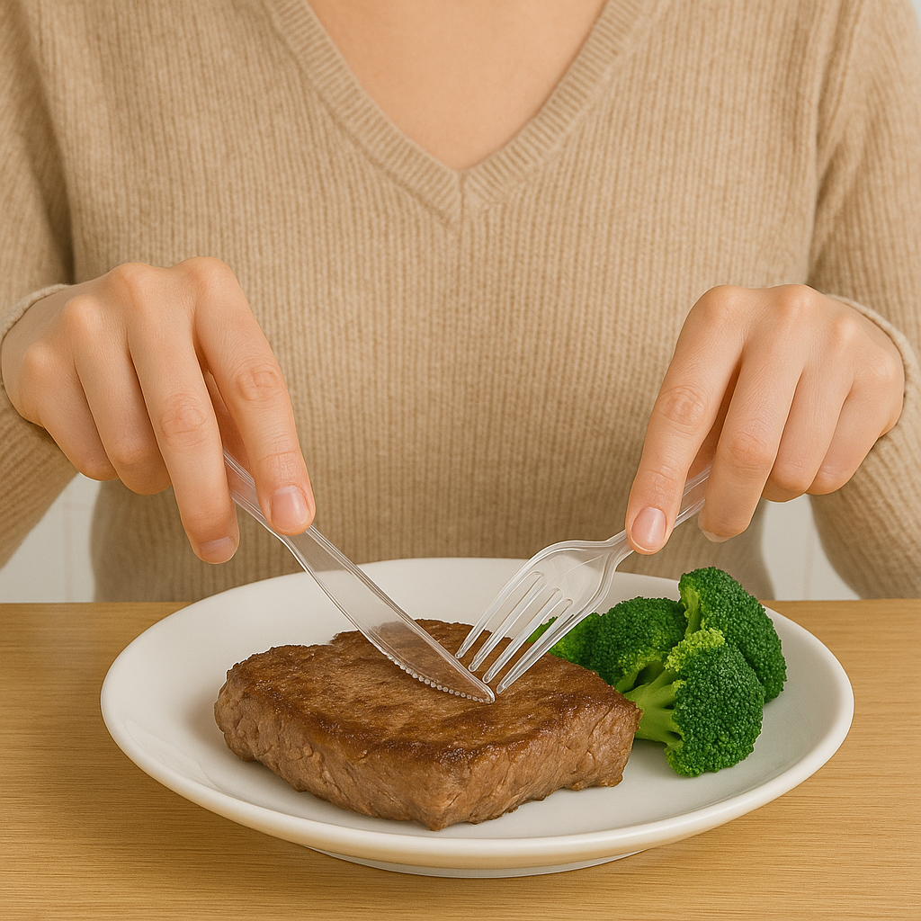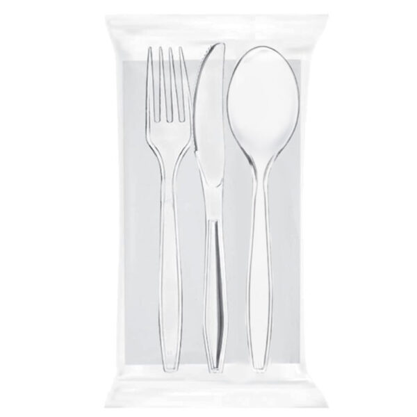 posate riutilizzabili in plastica dura con certificato di conformità. Posate di colore trasparente imbustate in comode confezioni contenenti ognuna un cucchiaio, un coltello, una forchetta e un tovagliolo.
